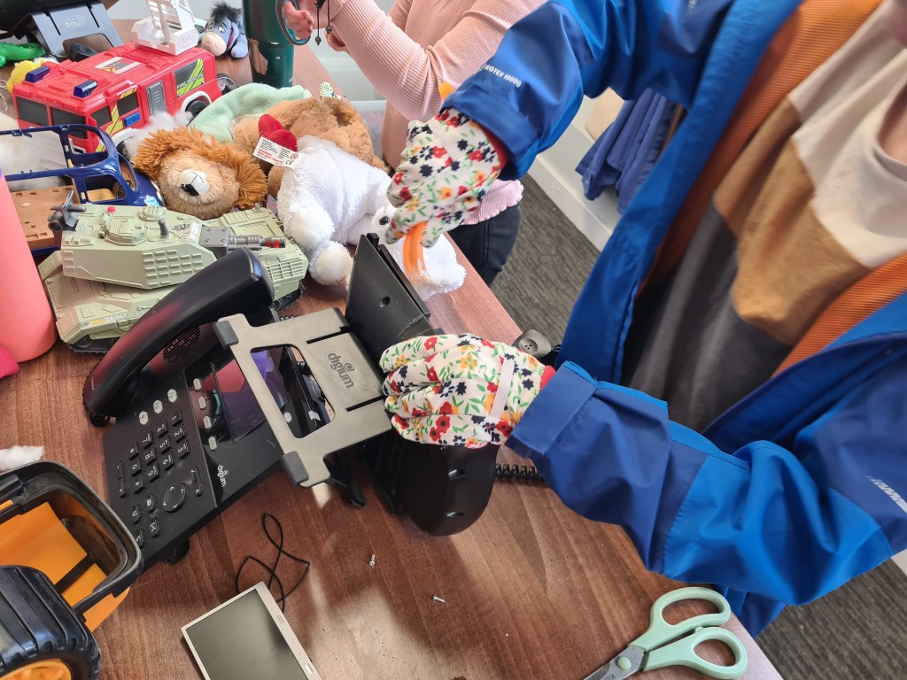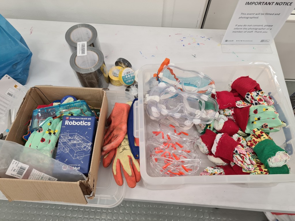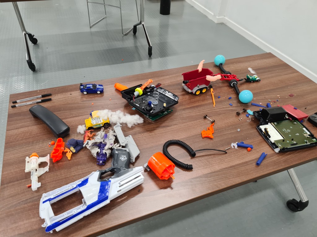 SERAI provided both Leeds Libraries and Barnsley Libraries with the funding to buy all the hand tools necessary to take toys apart, such as screwdrivers, pliers, wire strippers, and junior hacksaws along with safety equipment, but we didn’t want to purchase brand new toys only to destroy them as part of the event. The library services in Leeds and Barnsley put calls out to their communities to encourage families to donate their old, broken or unwanted toys to their nearest library, which added a sustainable aspect to the event by giving toys destined for landfill a new life! It wasn’t only families that got involved – local businesses and charities such as Revive Reuse CIC also provided toys. While we encouraged people to take their creations home with them, some also decided to allow us to display them in public Art Libraries!